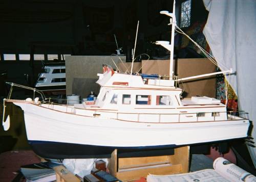 Emma Lou was our 36′ 1966 woodie Grand Banks. I gutted and refit her but made the model one winter before we finished the refit. The model and the boat are not exact matches as a result. We called the model Baby Emma and this one has remote control motor. She zips along pretty fast in the water!